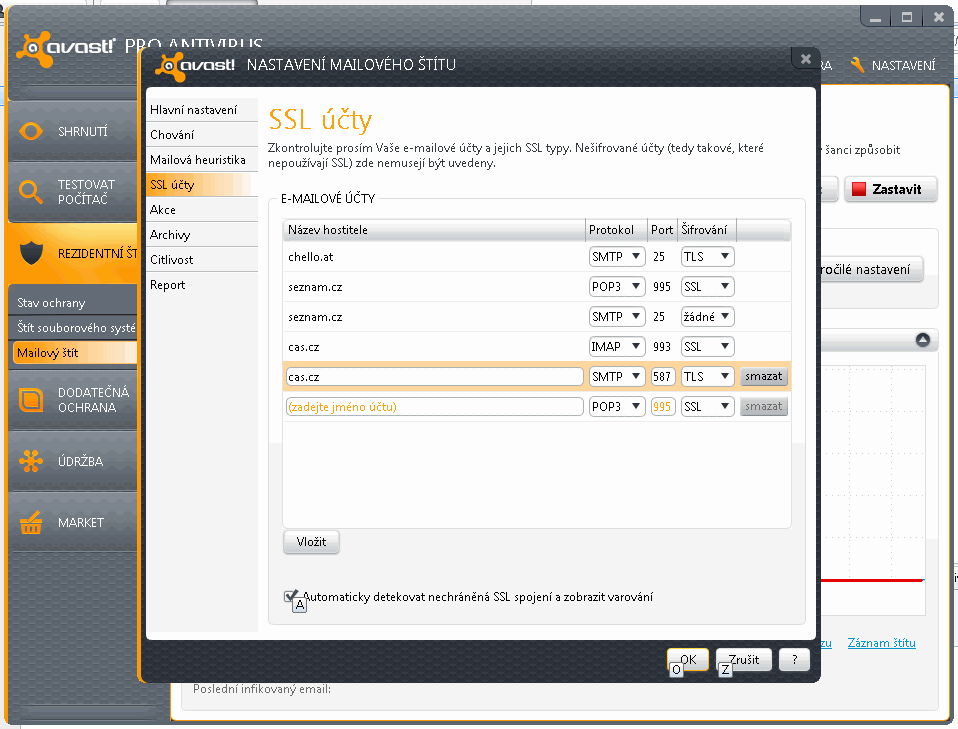 U antiviru Avast! 7 Pro došlo k tomu, že při zapnutém Mailovém štítu nefungovalo odesílání mailů. Pokud je toto i váš problém, tak v hlavním rozhraní Avastu v sekci Rezidentní štíty\Mailový štít klikněte na Pokročilé nastavení, vyberte SSL účty a zkontrolujte, že u řádku cas.cz SMTP je port 587 a šifrování TLS. Pokud ne, je nejjednodušší takový řádek smazat, Avast si ho vytvoří znovu a korektně.
