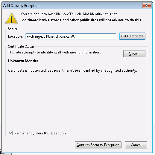 Při prvním pokusu se odeslání pravděpodobně nepovede, ale kromě chybového hlášení (které odklikneme) se zároveň objeví dialog pro přijmutí neznámého certifikátu (pozor: minimálně u verze Thunderbirda 14.0 docházelo k tomu, že toto okno je někdy překryté vlastním oknem s odesílanou zprávou).